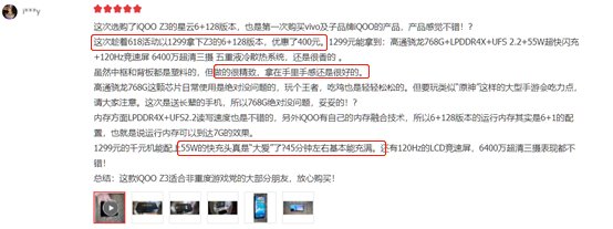 今年618年中大促开启以来,iQOO Z3产品力受到高度好评,“55W闪充”、“反应速度很快”、“拍照效果清晰”、“待机时间不错”、“外观精致”等方面受到消费者真心肯定。