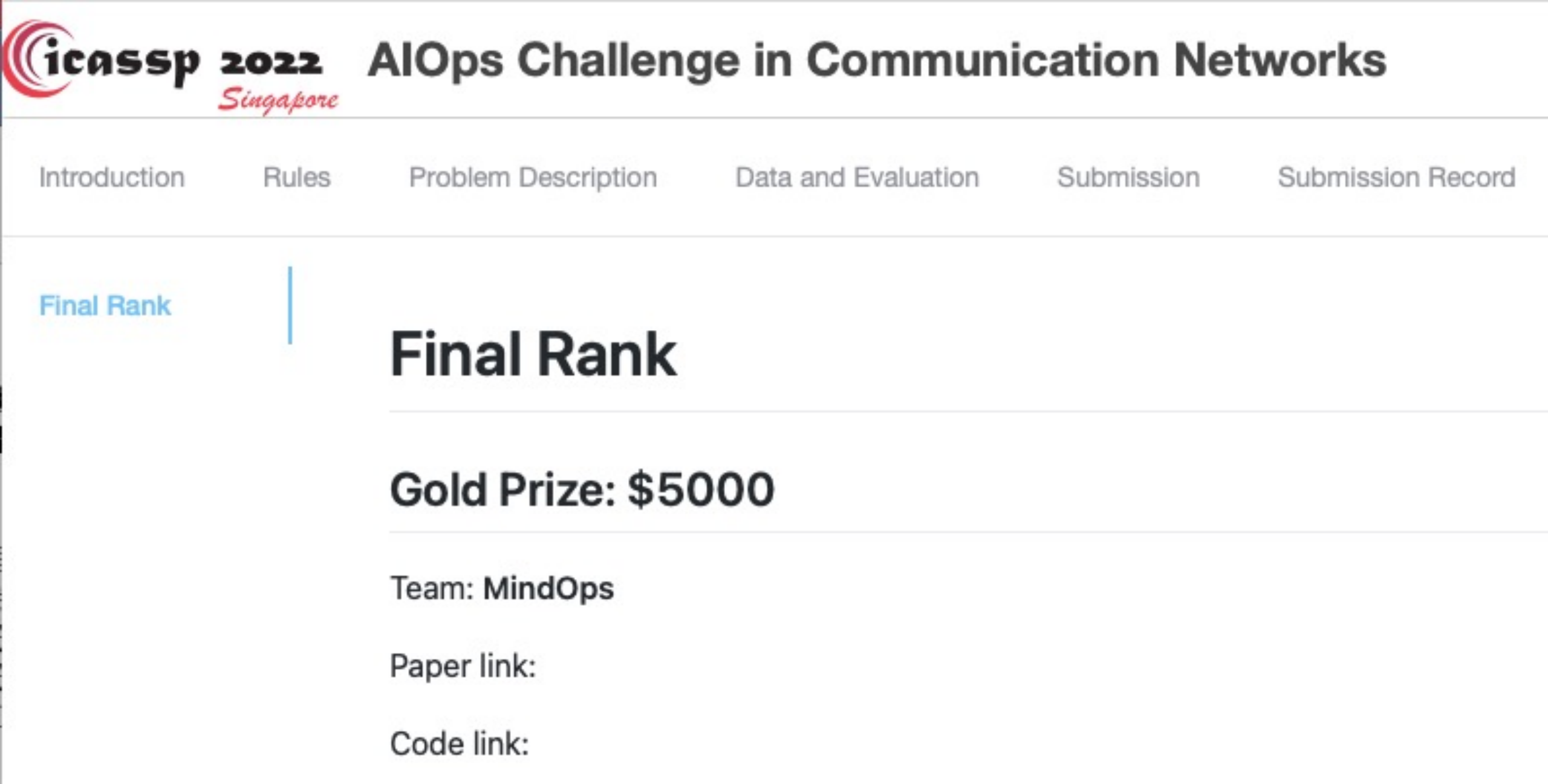 ICASSP(International Conference on Acoustics, Speech and Signal Processing)是信号处理领域规模最大的国际学术会议。其中,ICASSP’22 AIOps Challenge网络智能运维竞赛由香港中文大学(深圳)等机构主办,希望用机器学习等方式来自动找出网络故障的根本原因,此次共有382支队伍参赛。由阿里达摩院决策智能实验室和阿里云计算平台组成的团队获得冠军,并受主办方之邀将其中主要算法以论文的形式发表在ICASSP上。