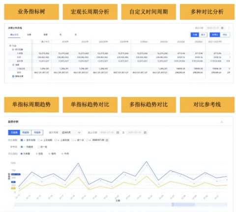 在宏观指标的分析过程中,分析师通常需要看到不同时间粒度的的数据,并对单个指标进一步的分析,如看指标的对比数据,看指标的均值、去节假日、均一化等。这时候Quick BI的决策分析组件、趋势分析表格就可以大展身手了。趋势分析表格可以看到指标在年度、季度、月度、周、日以及自定义时间范围等不同时间粒度上的数据,快捷切换指标的均值、累计值以及环比、年同比等不同的对比值,并可以借助线图的能力对指标进一步分析,在线图上展示均值线、归一化线、不同的对比周期线等等。