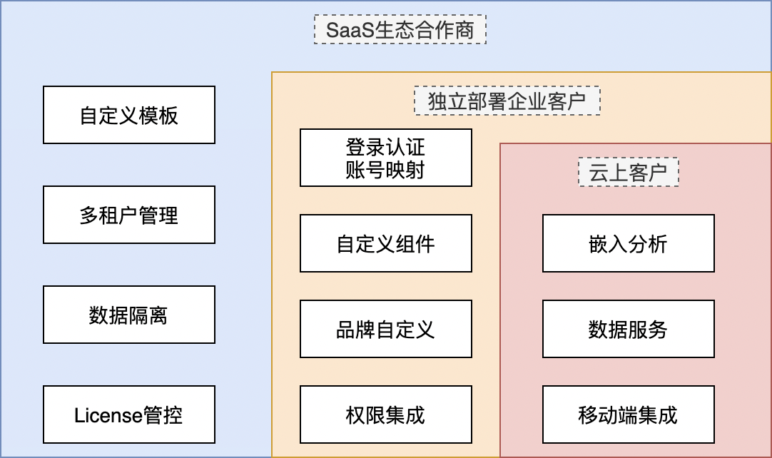 随着Quick BI支撑的客户基数越来越大,集成的场景需求也越来越丰富多元。对于客户在阿里巴巴系统集成的诉求,Quick BI可提供如钉钉智能报表、阿里巴巴生意参谋的集成连接;对外部系统集成诉求,Quick BI既有为众多独立部署企业客户提供的单租户管理服务,又有像睿本云的生态SaaS化服务集成。因此,需要抽象出通用的开放集成能力,才能往上支撑丰富的客户集成场景,提升产品的商业化能力。