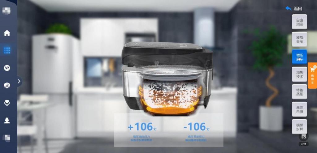 以国内某家店品牌利用 51 建模网的在线模型编辑器做的 3D 电饭煲展示为例。该电饭煲品牌在电饭煲 3D 模型上进行了多元化的编辑设置。如电饭煲液晶显示、电饭煲增压过程动画展示、加热技术展示、蒸饭做菜动态过程、电饭煲模型部件拆解等动态交互效果展示。全方位展示电饭煲内部零部件细节及工作原理,给予消费者超现实的产品体验与视觉冲击,还能与线下全渠道营销布局相结合,产品营销效果可观。