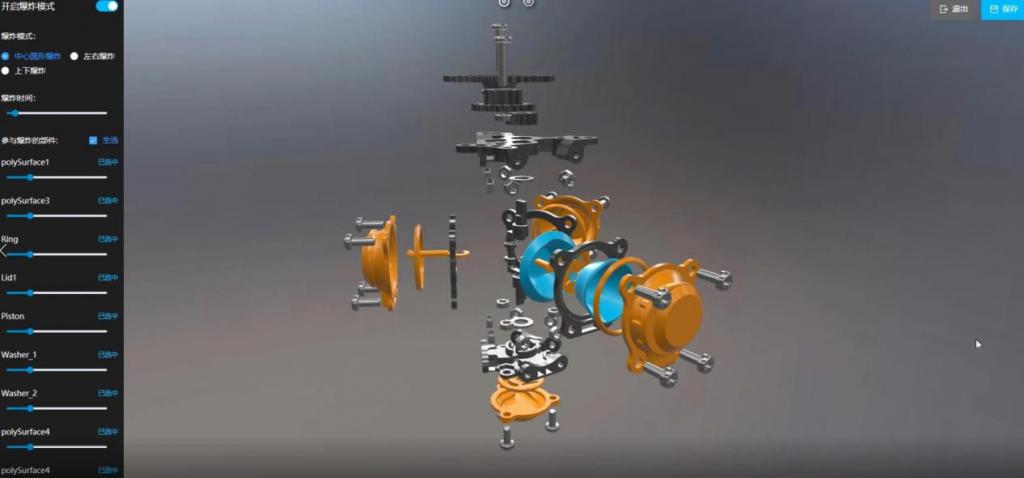 创作者只需要在 51 建模网平台绑定模型部件组,展示终端便能实现模型部件替换。创作者如果想要向用户展示产品模型内部构造原理,可以通过模型编辑器的爆炸效果进行设置,终端自动生成爆炸动画,通过控制爆炸开和爆炸关效果,全面展示产品。