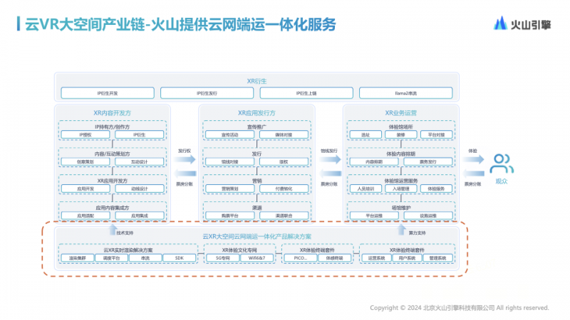 火山引擎云 XR 大空间产品解决方案覆盖了云 XR 大空间涉及的不同技术环节,可实现云网端运一体化快速交付,通过稳定的帧率、稳定的码率、稳定的延时、稳定的并发和稳定的连接成功率,推动云 XR 大空间在文旅、教育、工业设计、娱乐等行业加速落地。