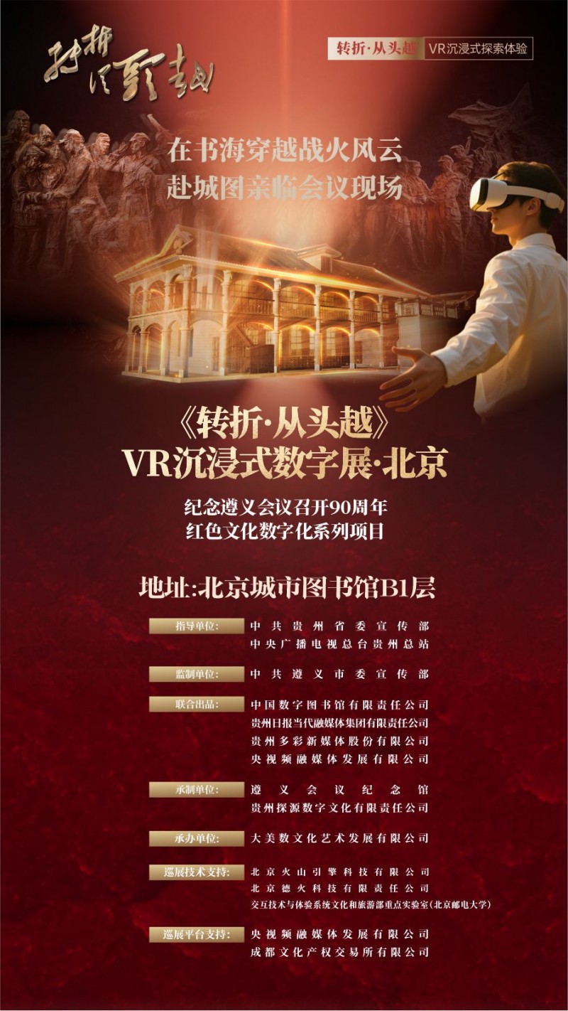 7 月 1 日,纪念遵义会议召开 90 周年红色文化数字化系列项目——《转折·从头越》VR沉浸式数字展在首都图书馆东区(暨北京城市图书馆)正式开放。