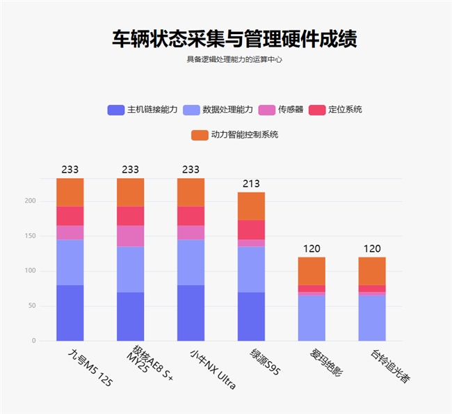本月参评的车型中,除爱玛绝影和台铃追光者外,其余车型均支持OTA升级,九号、小牛、极核三家得到相同的233分。九号M5 125首发搭载了凌波OS系统,全新升级了真智能3.0和RideyFUN智驾系统,配备光感、座垫及边撑感应器,支持北斗卫星、基站、GPS三模精准定位。