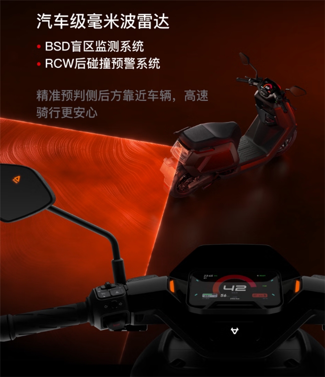 小牛NX Ultra上也有一个黑科技,汽车级毫米波雷达,行驶中如果后方和侧后方有人车通过,仪表和后视镜上会亮灯提示,这项配置在城市快速路上还是很实用的,可以避免一些因视野盲区发生的事故。但经过我们长期的体验,这几个提示灯基本就是常亮状态,晚上很影响视线,判定还是有些过于积极。