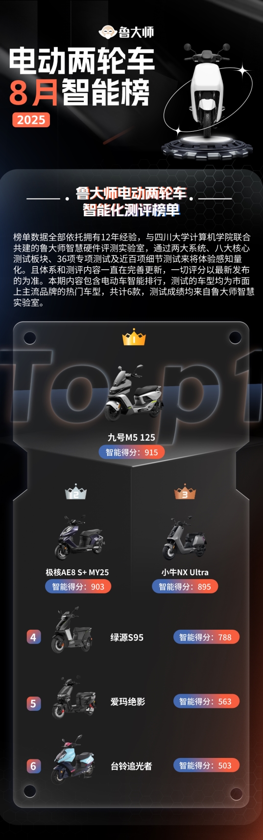 鲁大师8月电动两轮车排行榜数据来源于鲁大师智慧实验室,测评的车型均为市面上主流品牌的主流车型。截止目前,鲁大师智能化电动车测评的车型高达260余台,且还在不断增加和丰富中。