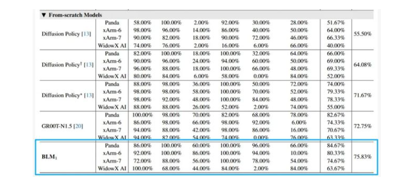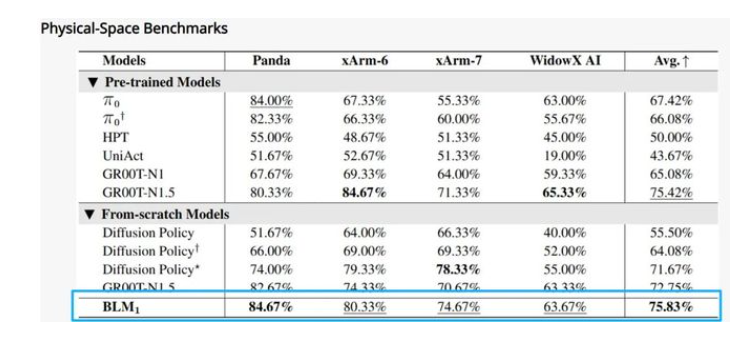 物理空间基准测试时,BLM-1.0在跨4种机器人本体(Panda、xArm-6、xArm-7、WidowX AI)各6大不同难度的操作任务中,平均得分达75.83%,超越主流 VLA 模型,验证了 BLM-1.0 的跨本体泛化能力。