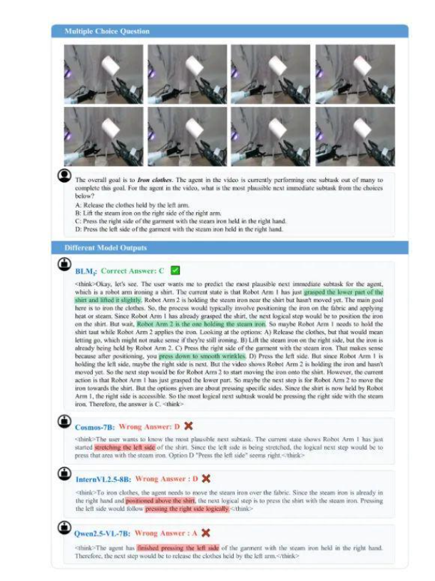 在机器人操作场景任务中,BLM-1.0 展现出卓越的空间理解与任务规划能力。如图所示,模型需要判断机器人熨烫衣物过程中下一步最合理的动作。