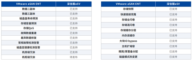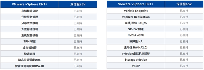 ○ 计算虚拟化aSV:对标VMware vSphere常用139项功能,实现123项,在所有的国产厂商中对VMware的功能满足度最好。同时,深信服具有突出性可靠性优势,例如:硬件亚健康能力覆盖CPU\内存\主板\Raid卡\磁盘\电源等故障预测和兜底,在能力上和VMware持平;热升级(update)、热迁移(vMotion)、热补丁能力表现上超越 VMware 产品;HA 联动亚健康与热迁移,实现对潜在问题的主动预防,效果优于Proactive HA;动态智能调度对业务影响更小,调度可靠性更高,相比 VMware 提供更优的调度效果。