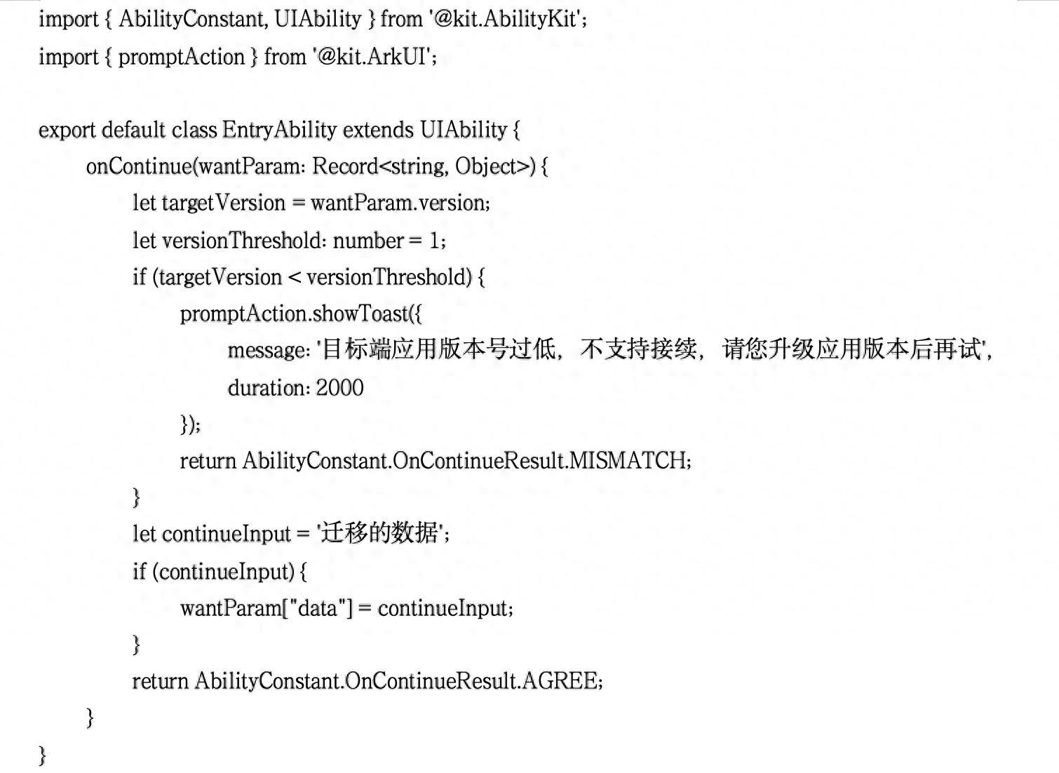 onContinue() 是应用接续中源端UIAbility的关键接口。当应用触发迁移时,这个接口会在源端被调用。开发者可以在这个接口中完成多项重要操作,比如保存迁移所需要的数据。你可以把当前应用的关键信息,像编辑器中的文本内容、浏览器的当前页面URL等,通过键值对的方式保存在 wantParam 中。同时,还能进行应用兼容性检测,从 onContinue() 的入参 wantParam.version 获取迁移对端应用的版本号,与源端应用版本号进行比对,判断是否支持此次迁移。如果版本不兼容,可以返回相应的错误信息提示用户。示例代码如下: