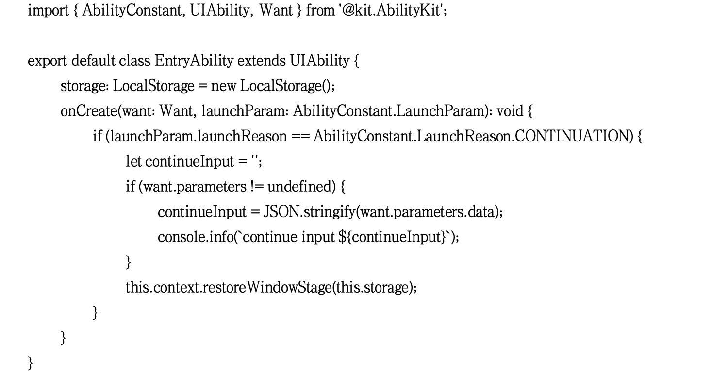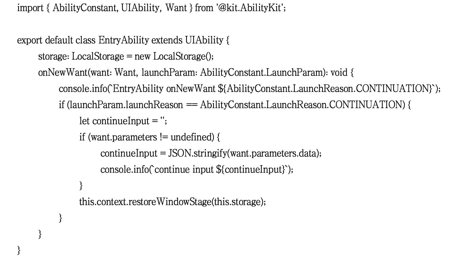 对于单实例应用,还需要额外实现 onNewWant() 接口。它的实现方式与 onCreate() 类似,也是在判断为迁移场景时,恢复数据并触发页面恢复。示例代码如下: