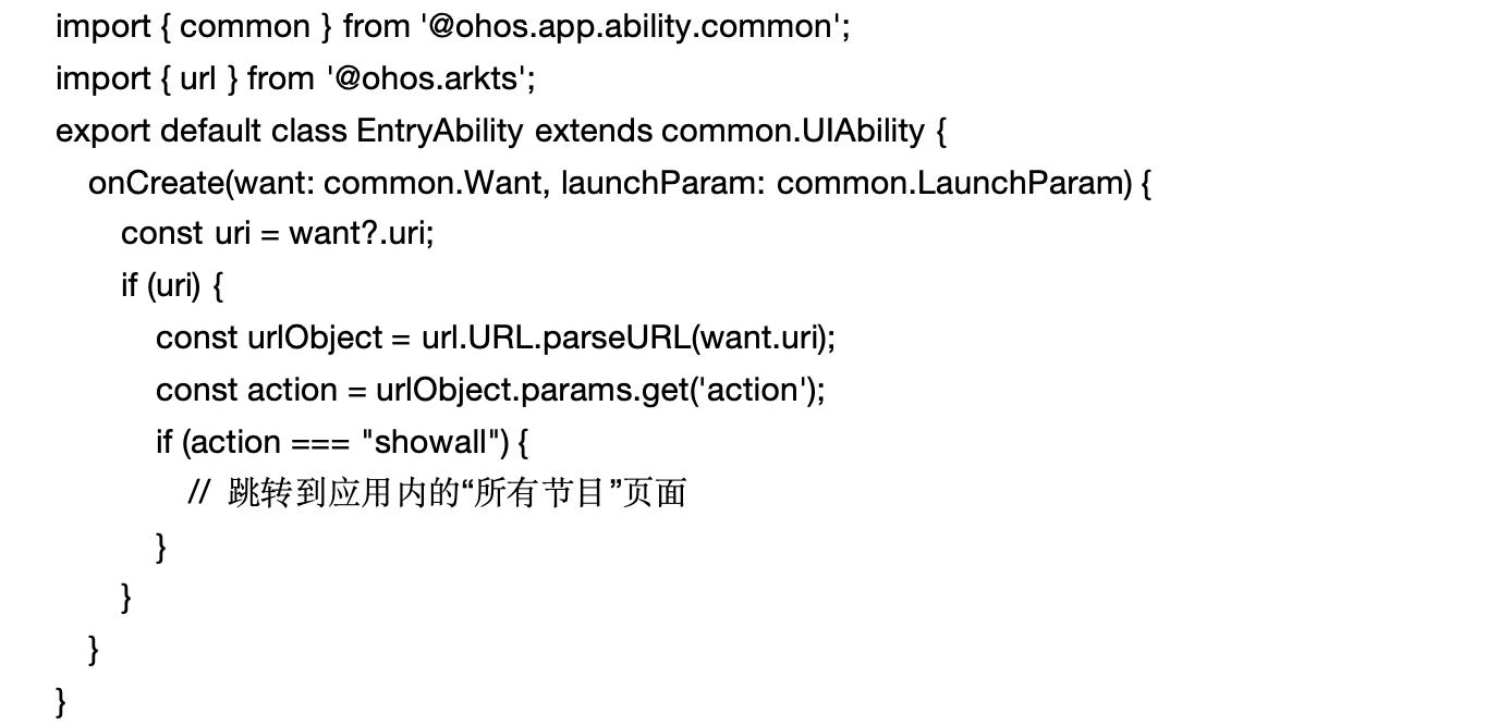 2、 拉起方应用在跳转接口中传入目标应用的 URL: 拉起方应用需要构建一个符合目标应用 URL skill 格式的链接,并传入相应的跳转接口。