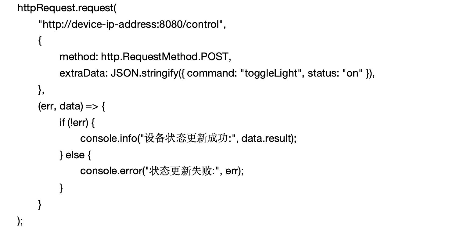 在智能家居系统中,状态同步是保持各设备间一致性的重要环节。例如,当用户通过主控设备打开灯光时,灯光状态应实时同步到其他相关设备。我们可以通过 HTTP 请求同步设备状态。