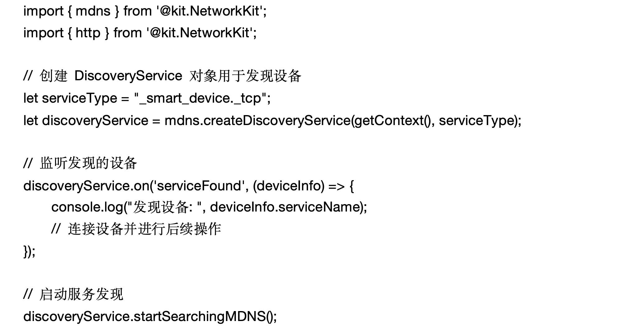 在上面的代码中,DiscoveryService 对象用于在局域网内发现指定服务类型的设备,连接建立后,我们可以通过 serviceFound 事件监听到发现的设备。