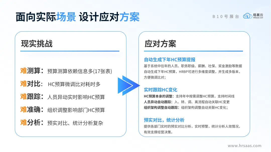 其次,在去年基础上做微调、对比,也会非常耗时。因为不同版本进行调整会非常的复杂,随之而来的就是数据准确性与跟踪难的问题。刚才提到HC本身的预算会发生变化,入转调离也会引起占编和空闲,组织重组等变动都会造成编制的变化。那最终的结果就是管理层实际上很难得到一个真实的预实对比,获得准确的数据。