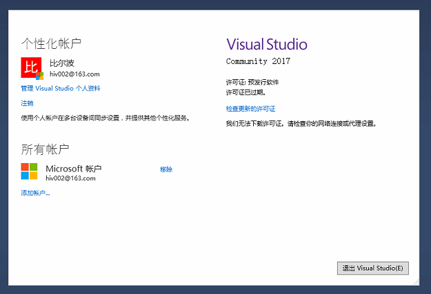visual studio installed in my D plate, after reshipment system login my Microsoft account is ok, but can not download the update license.The