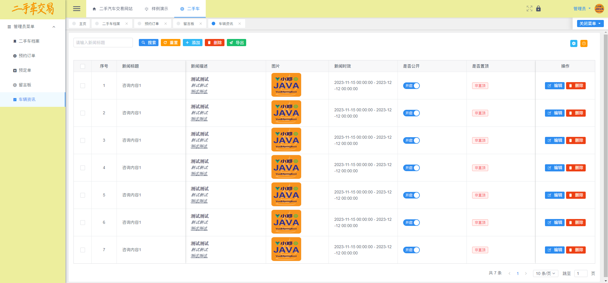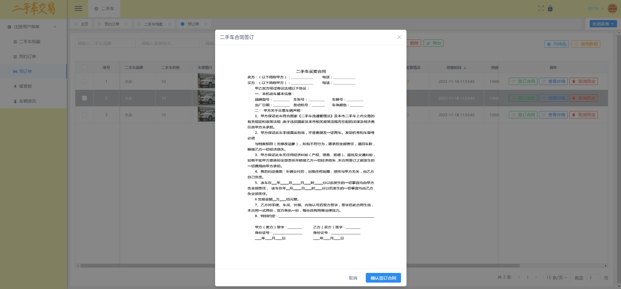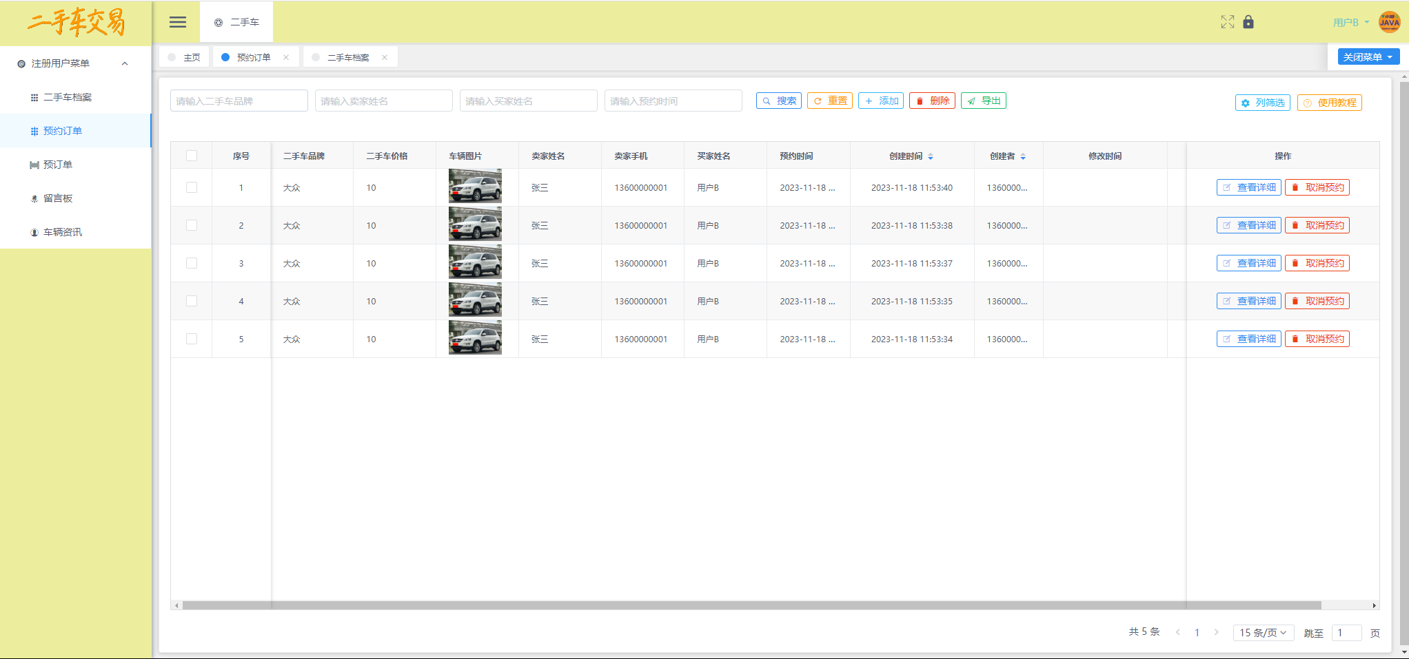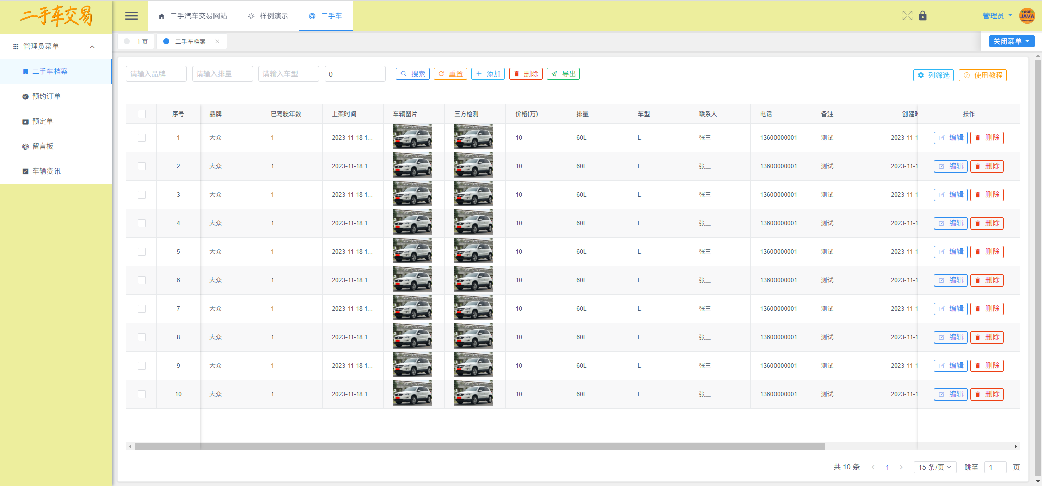 基于JAVA+Vue+SpringBoot+MySQL的二手车交易系统,分为管理后台和用户网页,包含了二手车档案、预约订单模块、预订单模块、留言板模块和车辆资讯模块,还包含系统自带的用户管理、部门管理、角色管理、菜单管理、日志管理、数据字典管理、文件管理、图表展示等基础模块,二手车交易系统基于角色的访问控制,给管理员、普通用户角色使用,可将权限精确到按钮级别,您可以自定义角色并分配权限,系统适合设计精确的权限约束需求。