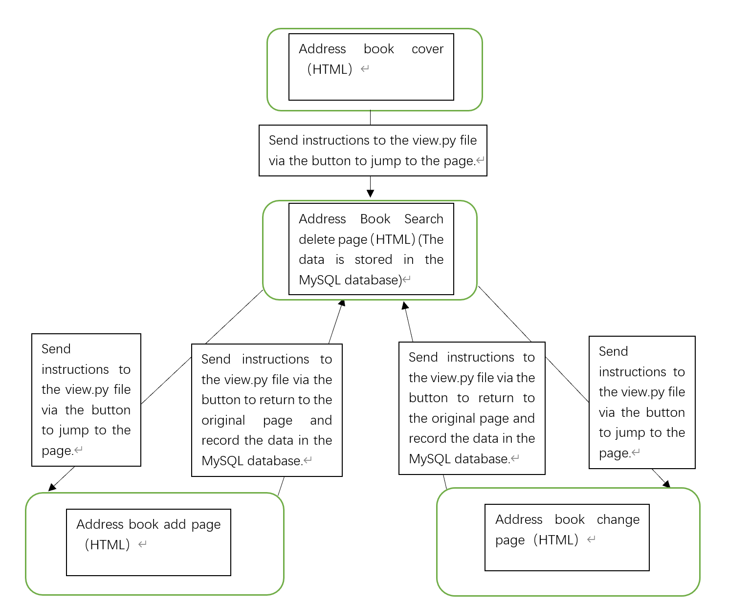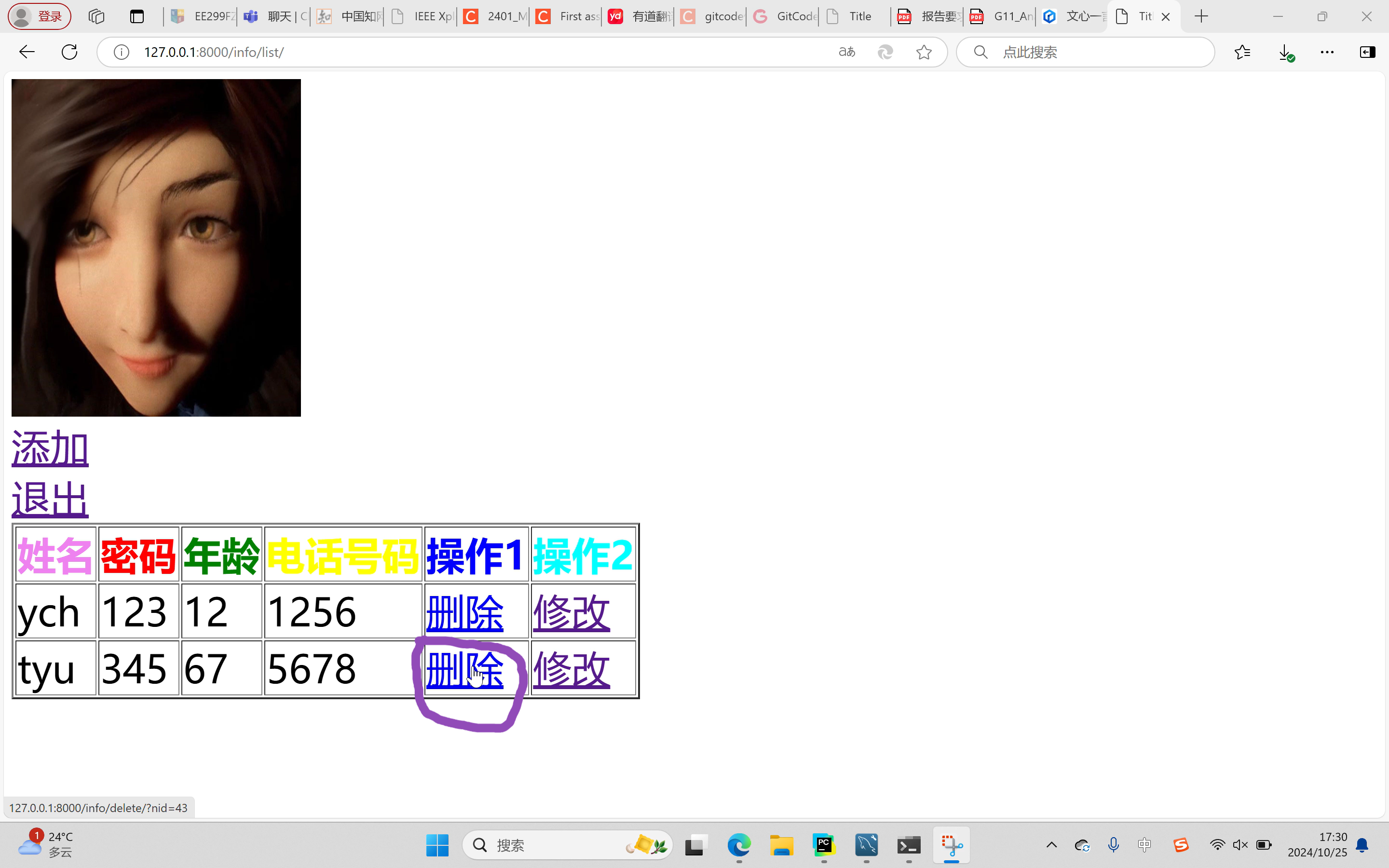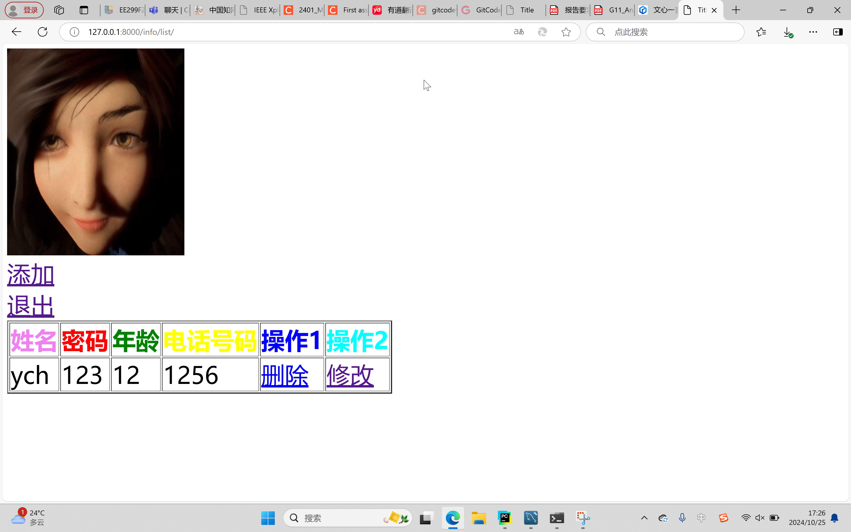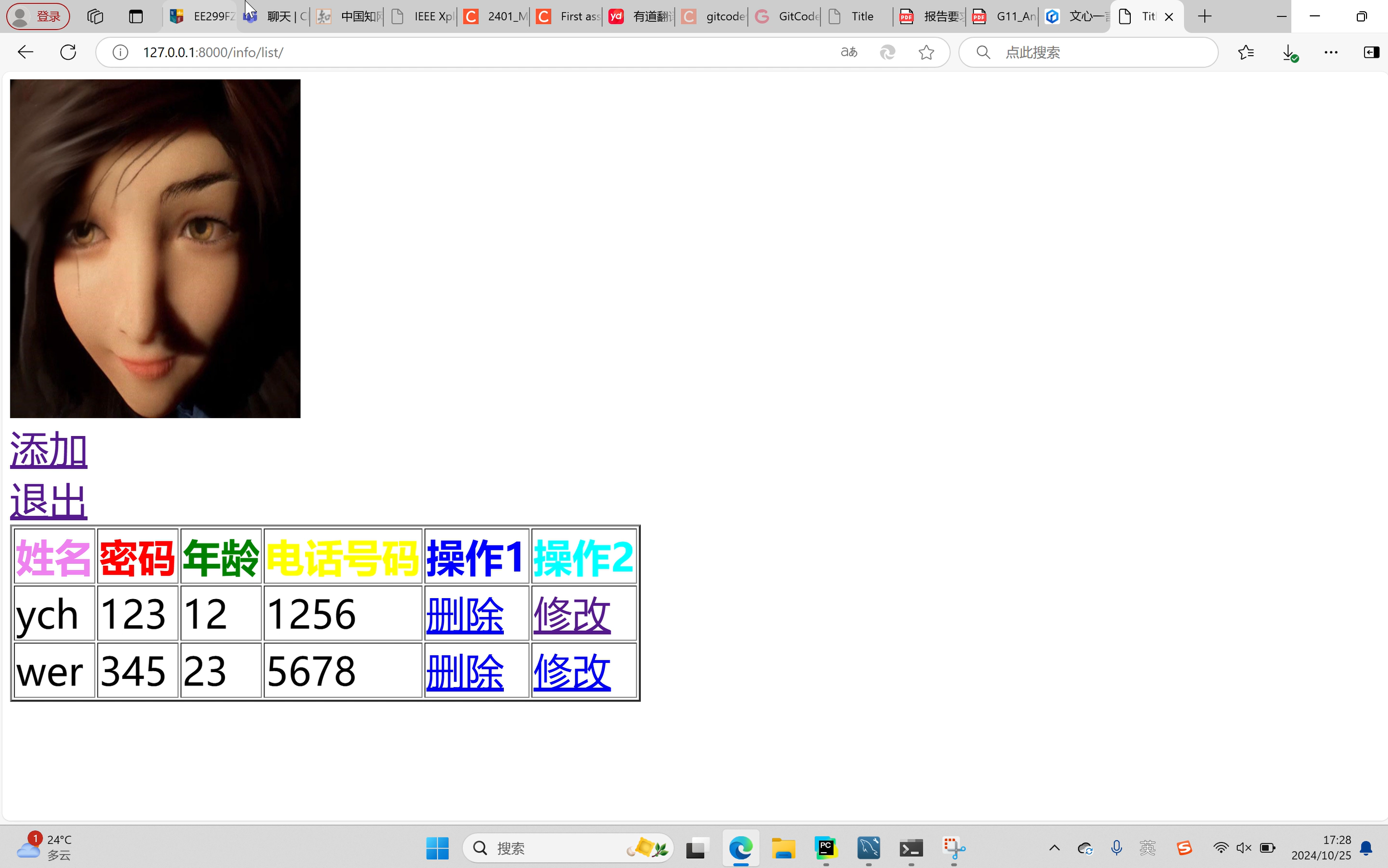 The contact list button is displayed on the start screen. When you click the button, the contact list screen is displayed. The query interface has buttons for add, exit, delete and modify. Click "Add" to enter the add interface, click "Modify" to enter the modify page, click "Delete" to delete data on the current page, click "Exit" to exit the address book. These pages are made up of html,css, input delete and modify data through pycharm's django to connect to the mysql database operation.